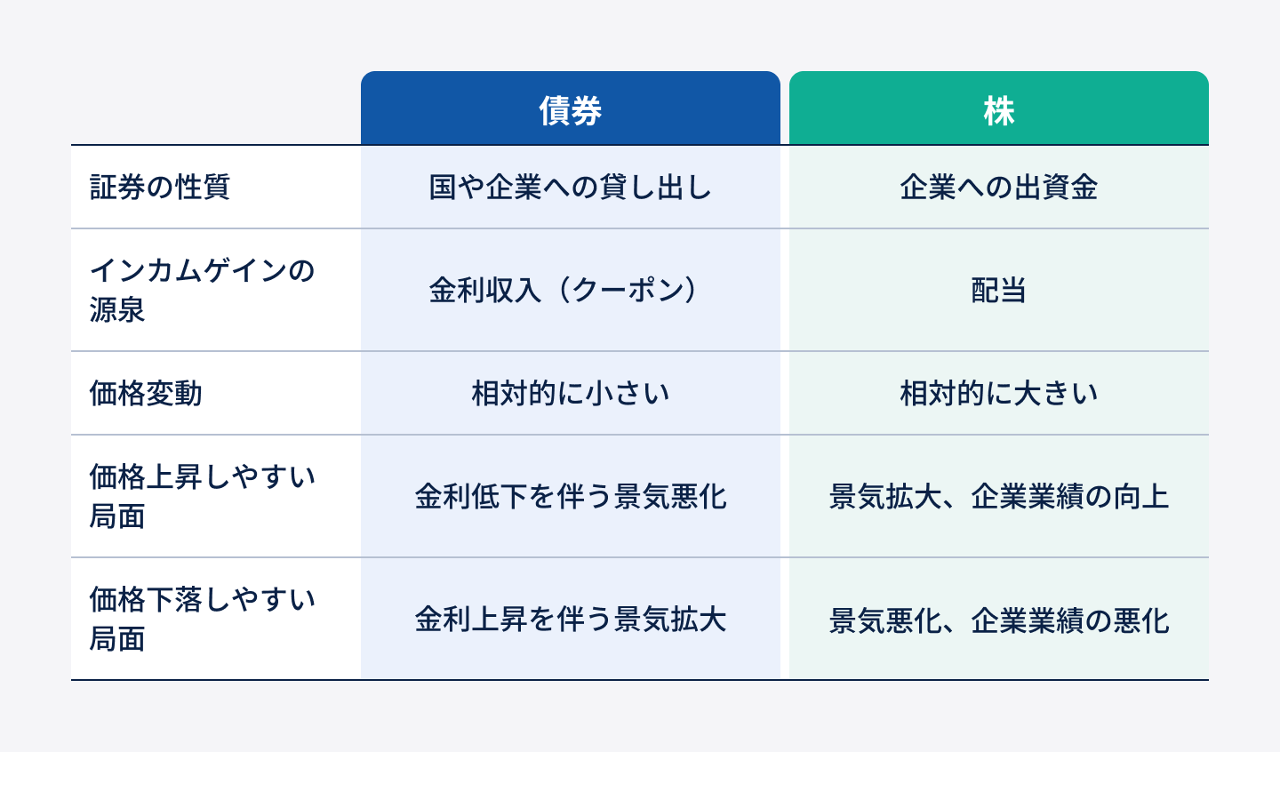 債券と株の特性を簡単に比較表でまとめると、次の通りです。