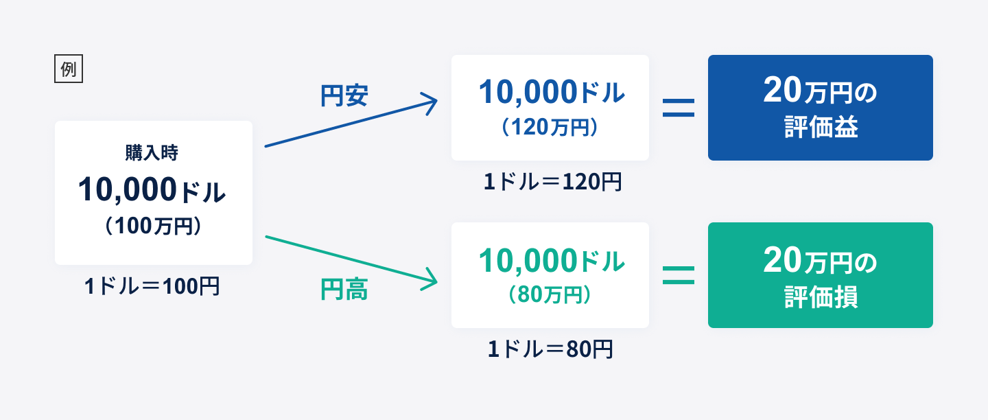 たとえば、米ドル建ての債券を購入した場合、保有期間中に得られる金利(クーポン)、満期時に受け取る償還金は全て米ドルで支払われます。もし、投資開始時点より円安になっていれば、円換算での受取額は増加し、円高では減少します。