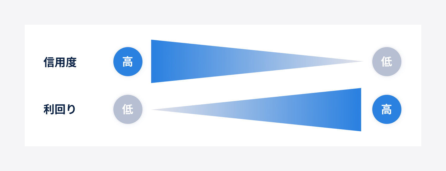 一方で、格付けが低い発行体の債券は、一般的にハイリスク・ハイリターンな債券です。自身のリスクに対する考え方に応じて、適度な格付けを持つ発行体の債券を選びましょう。