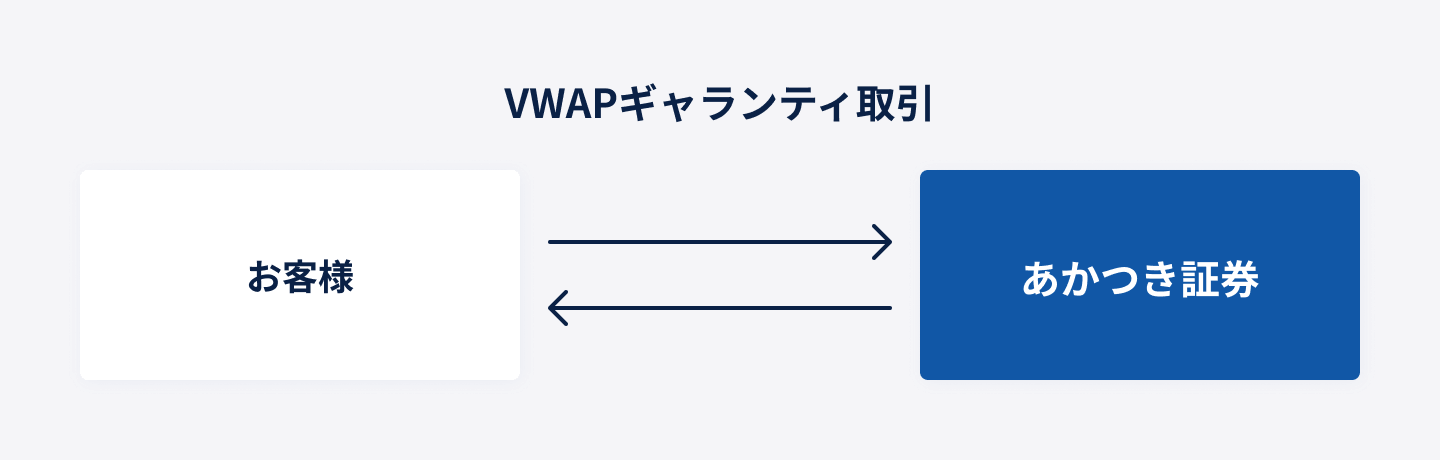 VWAPギャランティ取引とは、金融商品取引所に上場されている株式等を対象として、市場での売買から算出された個別銘柄のVWAP(出来高加重平均価格)を基準とした価格に一定のスプレッドを加減した価格で、お客様とあかつき証券が相対で行う取引です。